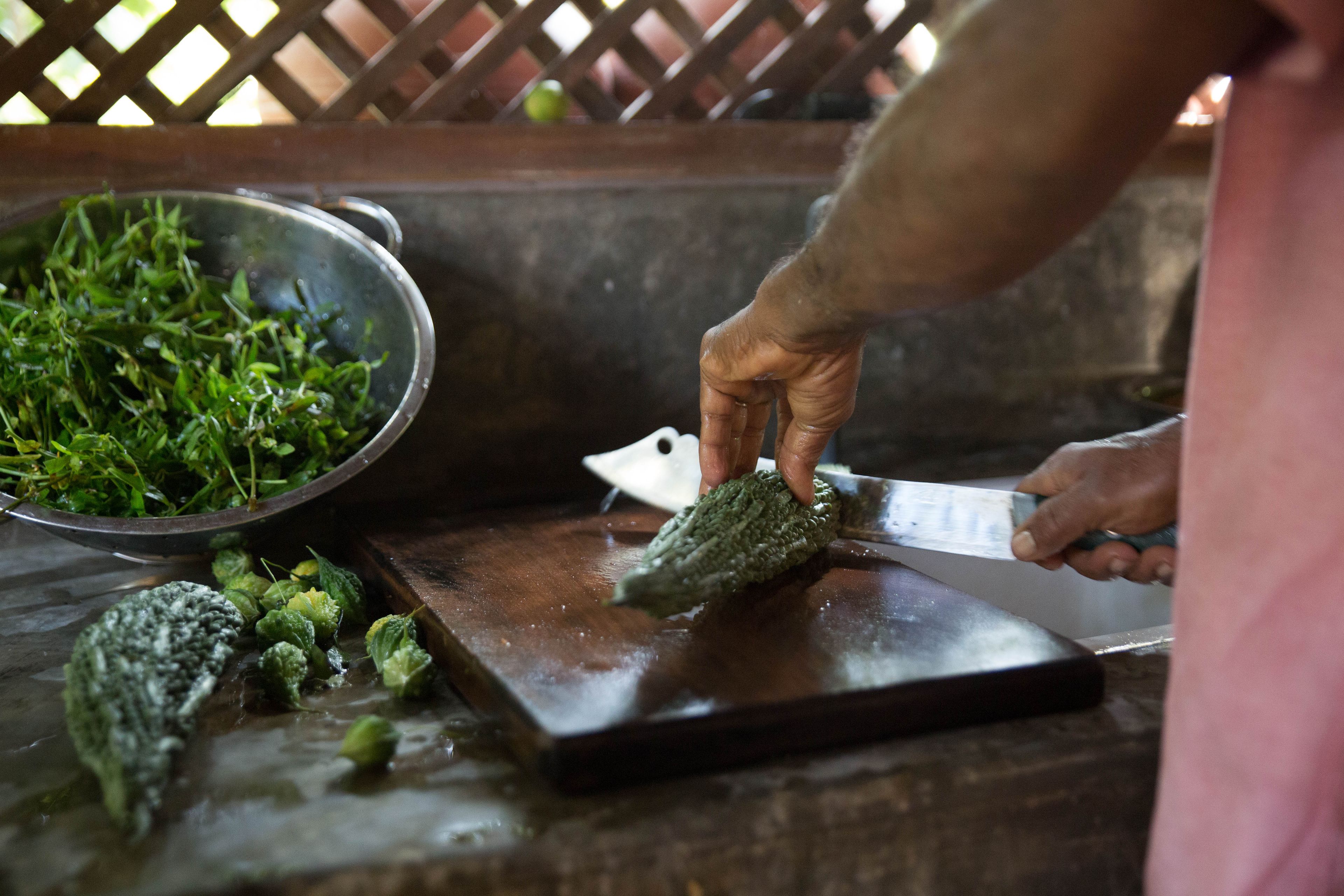 Our food is almost entirely vegan, naturally gluten-free, with an abundance of fresh vegetables, organic red rice and tropical fruit. Based on traditional rice and curries from the area, no specific ‘Master Chef’ has had a hand in the food. Instead, the dishes served at Ulpotha have evolved over its 25-plus-year existence by a simple process of elimination. As we have no electricity, all food is freshly picked, un-refrigerated, and cooked in terracotta pots on open fires.